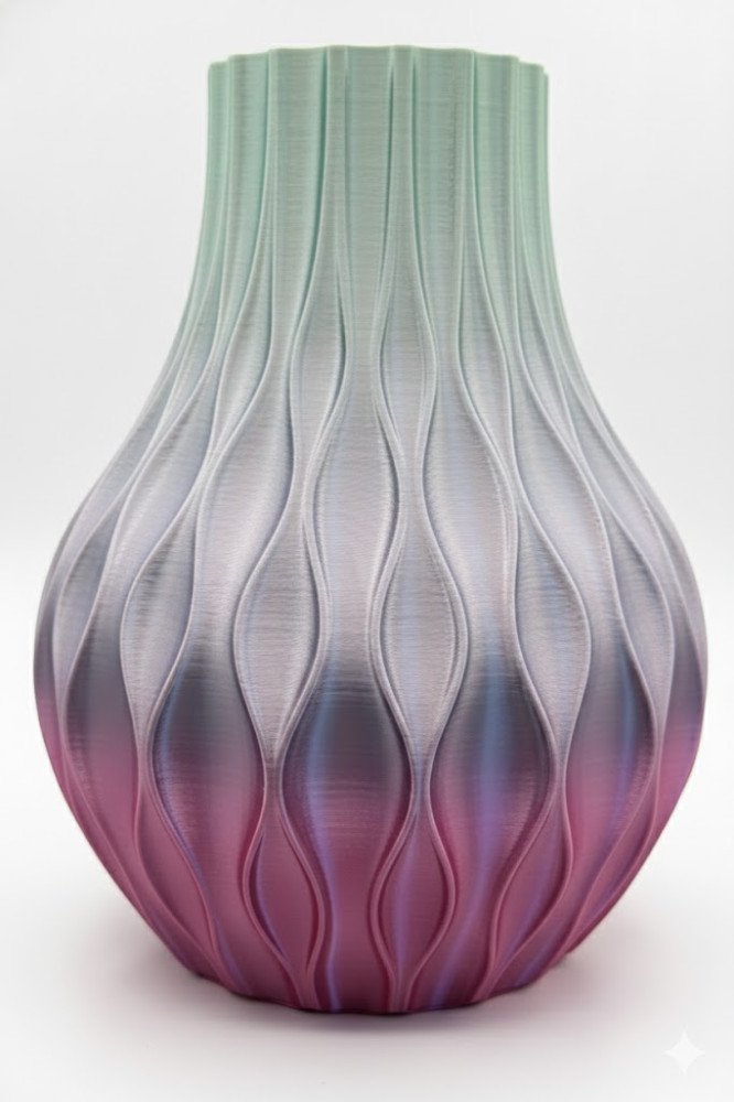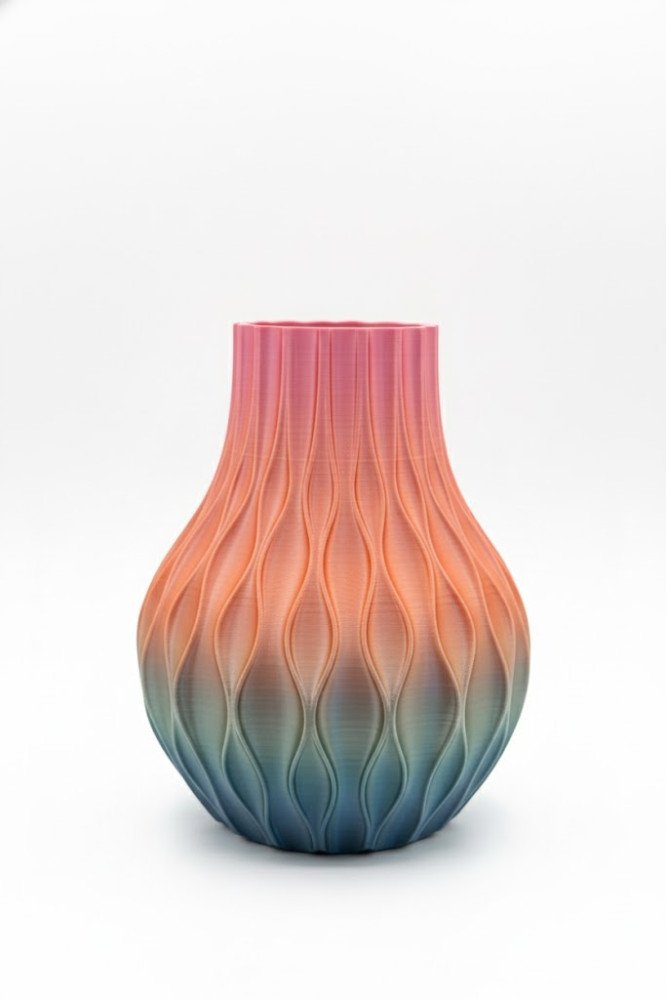 Bring a wave of vibrant tranquility to your home with the Aurora Ripple Vase. Crafted with an intricate, flowing ripple texture, this piece is designed to catch the light and showcase a stunning, graduated color palette of soft pink, cool blue, and many colors. This vase is more than just a container; it's a unique piece of 3D-printed art that serves as a captivating focal point in any room. Perfect for mantels, shelves, or as a centrepiece, its delicate pastel hues and dynamic texture will effortlessly elevate your decor.