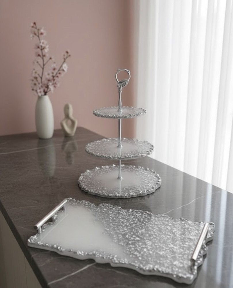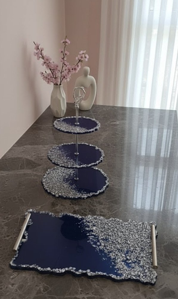 🍰 The Three-Tier Cake Stand Dazzling Display: Features three generously sized, circular tiers ideal for presenting cupcakes, pastries, finger sandwiches, or jewelry. Artisan Edge: Each tier boasts a unique, organic "geode" style edge that captures and reflects light, highlighted by sparkling gold leaf flakes.