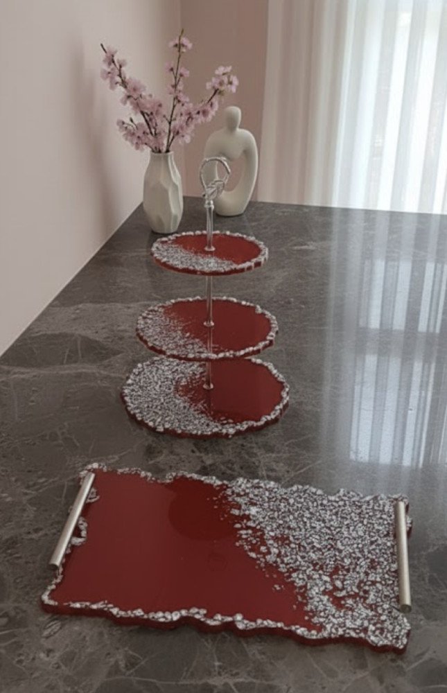 Please note that due to the nature of fluid resin art, each set is inherently unique. While the overall color palette and the dimensions remain consistent, the flow and distribution of the resin and gold leaf create a one-of-a-kind pattern and organic edge shape every time. This means your set is truly bespoke and no two pieces are exactly alike.