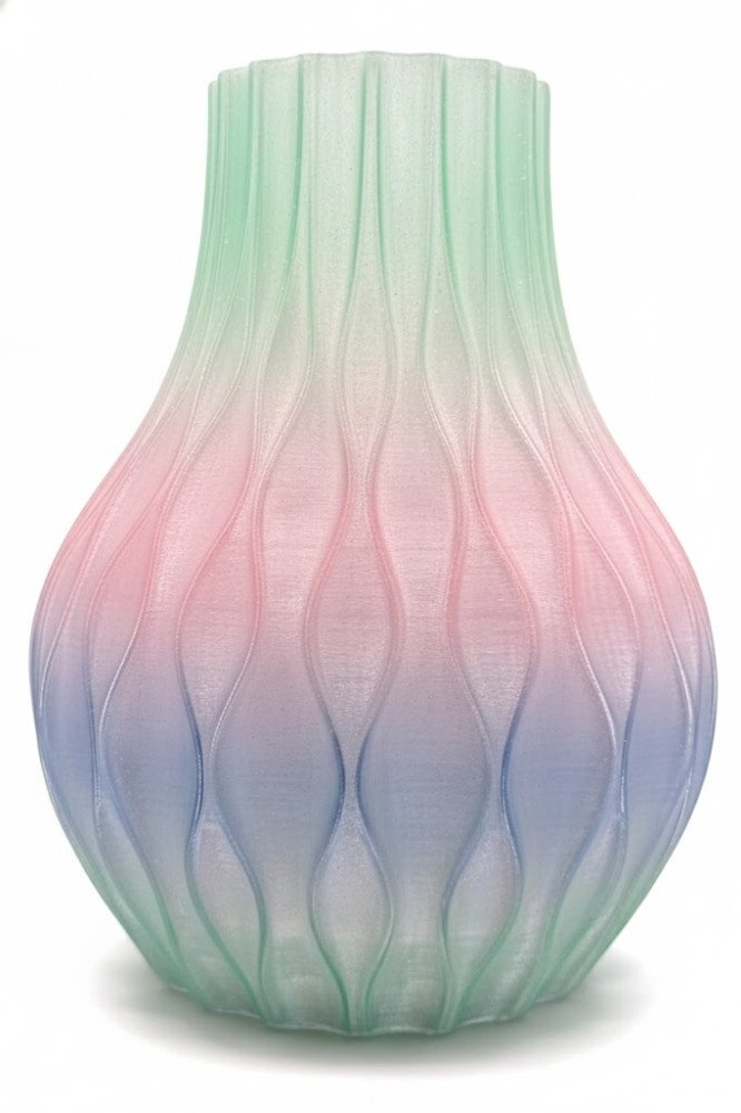 Bring a wave of vibrant tranquility to your home with the Aurora Ripple Vase. Crafted with an intricate, flowing ripple texture, this piece is designed to catch the light and showcase a stunning, graduated color palette of soft pink, cool blue, and many colors. This vase is more than just a container; it's a unique piece of 3D-printed art that serves as a captivating focal point in any room. Perfect for mantels, shelves, or as a centrepiece, its delicate pastel hues and dynamic texture will effortlessly elevate your decor.