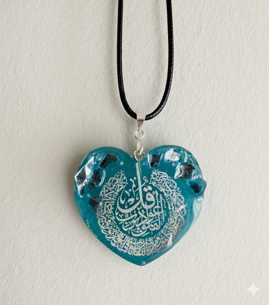 Embrace spiritual elegance with our pendants. This captivating piece features a sculpted, cloud-like blue resin pendant that beautifully showcases the sacred Arabic calligraphy for Suratul Alfalaq.